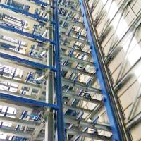 采用巷道堆垛机将搬运机器上的车辆水平垂直移动到存车位,通过存取机构存取车辆。出入口通常设置垂直升降机,这种车库自动化程度很高,且全部封闭式建造,车辆安全性好。该车库类型主要适用于大型密集式存车。